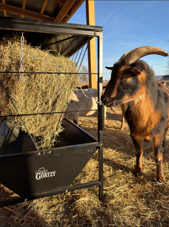 I’ve been using this Goatzy hay feeder for my goats, and it’s been working well so far. The heavy-duty steel construction feels solid, and it is made of high-quality material; the black powder-coated finish seems durable and rust-resistant. It holds a good amount of hay, and the V-shaped design really helps keep hay contained instead of ending up all over the ground.