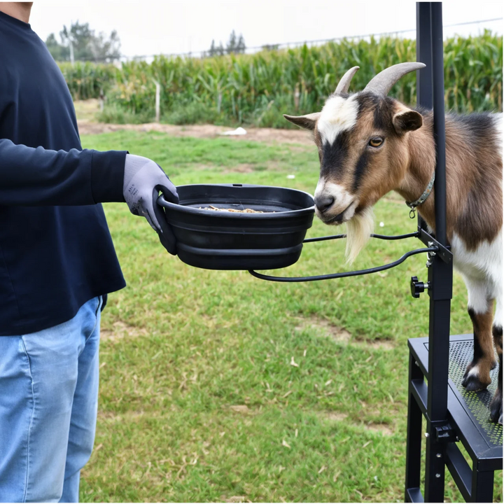 WHAT A GREAT GOAT STAND! I have 26 goats so I ordered two. I’m obsessed with this. Comes with feeder bowl , removable side rails, wheels, and height adjustment- EVERYTHING is adjustable. Works super well as a hoof trimming stand , perfect milking stand, and the built in feeder will make milking and grooming so much easier. I can’t wait to see what other goat products they come out with! Super sturdy high quality metal they put a lot of thought in this design